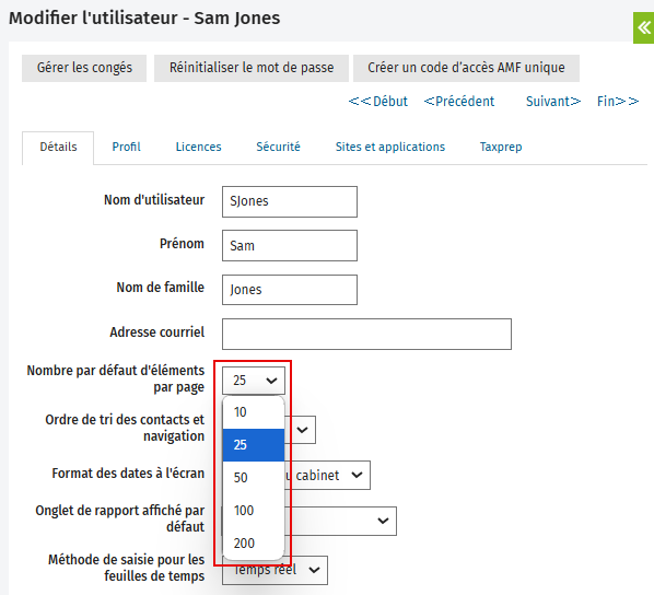 - Dans la page Modifier l’utilisateur, repérez l’option Nombre par défaut d’éléments par page.