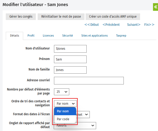 - Dans la page Modifier l’utilisateur, repérez l’option Ordre de tri des contacts et navigation.
