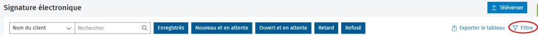 Vous pouvez filtrer la liste à l’aide des états Enregistrés, Nouveau et en attente, Ouvert et en attente, Retard et Refusé.