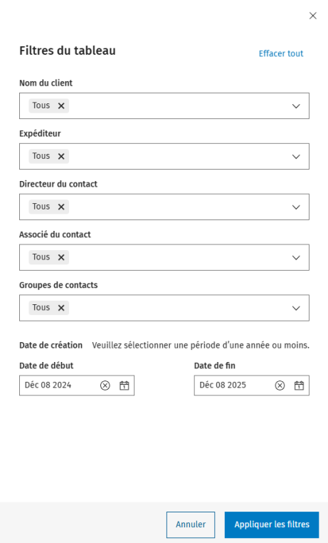 Vous pouvez aussi filtrer la liste à l’aide des champs Nom du client, Expéditeur, Directeur du contact, Associé du contact et Groupe de contacts ainsi qu’au moyen d’un intervalle de dates.