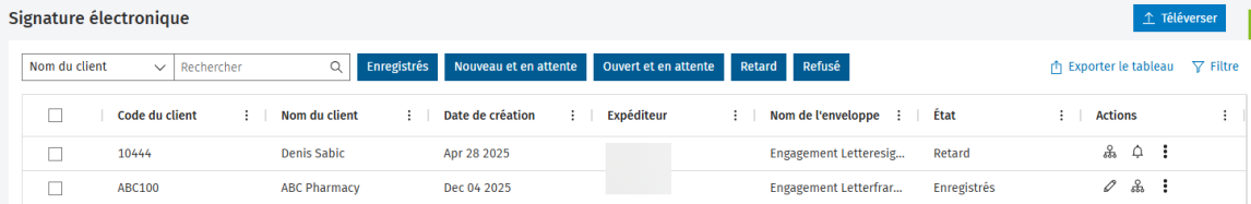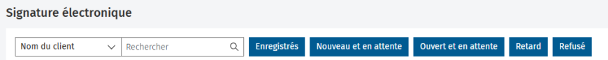 Toutes les signatures qui sont en cours de traitement s’affichent dans le tableau de bord. Les nouvelles enveloppes et les enveloppes en attente seront affichées par défaut.