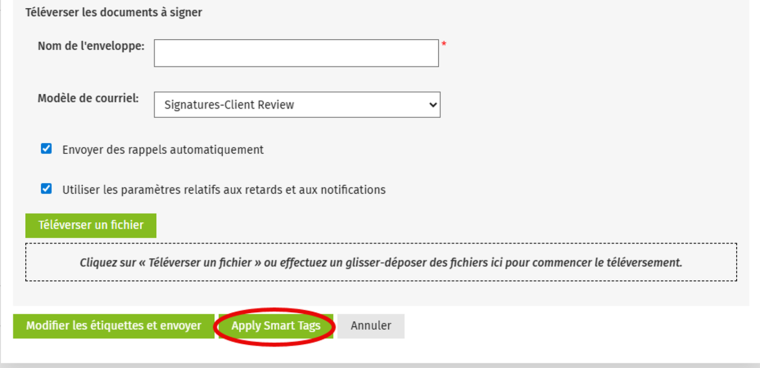 Vous pouvez dorénavant activer les étiquettes de signature dans les fichiers PDF qui sont téléversés au moyen du portail en cliquant sur le bouton Apply Smart Tags avant d’envoyer l’enveloppe pour signature.