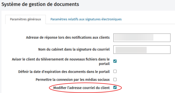 Pour permettre aux clients de mettre à jour leur adresse courriel, vous devez activer la case à cocher Modifier l’adresse courriel du client dans Paramètres > Portail > Paramètres du portail.