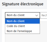 À partir du tableau de bord, vous pouvez rechercher des enveloppes pour un nom de client, un code de client et un nom d’enveloppe en particulier.